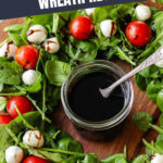 A festive and simple Caprese Salad Wreath featuring fresh arugula, grape tomatoes, mozzarella pearls, and basil, drizzled with balsamic vinaigrette, perfect for holiday parties or light meals.