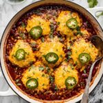 - Assemble casserole: Drop the cornbread batter onto the chili base in 6-8 mounds. Optionally top each mound with a sliced jalapeno for extra heat.