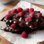 A delightful and easy-to-make chocolate bark featuring layers of white and dark gluten-free chocolate with frozen raspberries, perfect for a no-bake dessert that combines fruity tartness with rich chocolate.