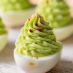 These Christmas Tree Deviled Eggs are a festive and delicious holiday appetizer featuring creamy avocado-infused filling piped into egg white halves to resemble Christmas trees, topped with colorful red pepper flakes and star-shaped yellow bell pepper decorations.