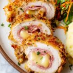 This classic Cordon Bleu Chicken recipe features tender chicken breasts stuffed with Black Forest ham and Swiss Gruyere cheese, coated in a crispy panko and Parmesan breadcrumb crust, and baked to golden perfection. Finished with a creamy Dijon mustard sauce, this dish is a comforting and elegant main course perfect for dinner.