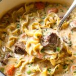 This creamy Beef Noodle Soup recipe combines tender top sirloin chunks, hearty egg noodles, and a flavorful medley of vegetables in a rich, aromatic broth. Perfect as a comforting meal, it features slow-baked beef that becomes melt-in-your-mouth tender, complemented by celery, carrots, peas, and fire-roasted diced tomatoes. With minimal hands-on prep and a long, slow cook in the oven, this soup is a satisfying dinner that reheats well and can be customized easily to taste.