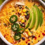 This Creamy Chicken Enchilada Soup is a comforting Tex-Mex recipe featuring tender shredded chicken, black beans, corn, and green chiles simmered in a flavorful base of chicken broth, red enchilada sauce, and fire-roasted tomatoes. Finished with cream cheese, heavy cream, and melted cheddar cheese, it offers a rich and creamy texture perfect for a quick and satisfying weeknight meal.