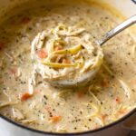 - If you prefer, this recipe can be adapted to slow cooker by sautéing veggies and making the roux on the stovetop first, then transferring all ingredients except dairy and noodles to the slow cooker for 4 hours on low before adding chicken, half-and-half, and noodles to cook for another 30 minutes.