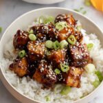 This Crispy Orange Tofu recipe is a delicious vegan twist on the classic orange chicken, featuring firm tofu cubes fried to a golden crisp and tossed in a tangy, sweet, and slightly spicy orange sauce. Ready in just about an hour, it's perfect served over rice and garnished with green onions and toasted sesame seeds, making a flavorful main course for any occasion.