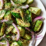 A refreshing and vibrant Cucumber Avocado Salad featuring sumac-marinated shallots, toasted sesame seeds, and fresh dill. This easy-to-make salad combines crisp cucumbers and creamy avocado with a tangy dressing, perfect as a light side dish for warm weather meals.
