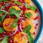 - Add pomegranate seeds: Evenly distribute the pomegranate seeds on top of the arranged oranges and onions, adding a burst of color and texture.