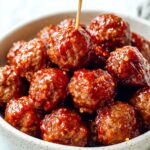 This Grape Jelly Meatball recipe features juicy, tender homemade meatballs smothered in a simple yet flavorful sauce combining grape jelly, barbecue sauce, red wine vinegar, soy sauce, and buffalo wings sauce. Perfect as an appetizer or a main dish served over mashed potatoes and veggies, these meatballs are sticky, sweet, tangy, and have a subtle kick that makes them irresistibly delicious.