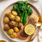 This Sheet Pan Honey Mustard Salmon recipe is a quick and easy one-pan meal featuring tender salmon filets glazed with a sweet and tangy honey mustard sauce, roasted alongside flavorful potatoes and broccoli. Perfect for a nutritious and balanced dinner in about 30 minutes.