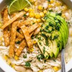 - Serve with Toppings. Ladle the white chicken chili into bowls and garnish with lime juice, fresh cilantro, diced avocado, sliced jalapeño, and crunchy tortilla chips for extra flavor and texture. Enjoy your warm, comforting meal!