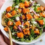 A vibrant and satisfying sweet potato salad featuring tender roasted sweet potatoes, peppery baby arugula, tangy dried cranberries, crunchy pepitas, and creamy feta cheese, all tossed in a flavorful honey mustard dressing. Perfect for a colorful fall salad that's easy to prepare and delicious to enjoy.