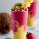 - Add liquids and fruits to blender: Combine the coconut milk, pineapple juice, frozen mango chunks, frozen raspberries or strawberries, banana, vanilla bean seeds, pineapple cubes, and kiwi slices into a high-powered blender.